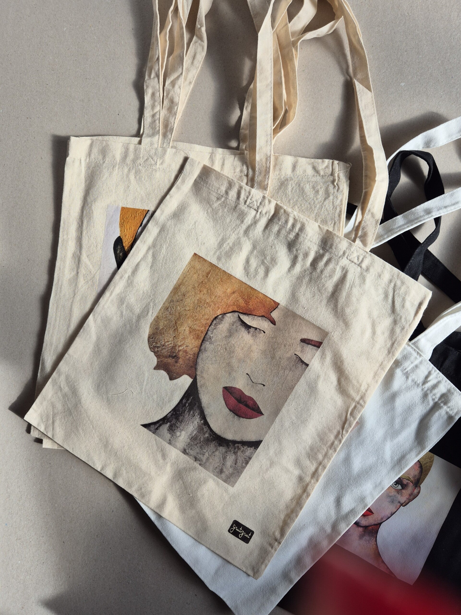 Deze katoenen tote bag draagt een fragment uit een van mijn schilderijen: een gezicht dat geen vaste identiteit heeft, maar ruimte laat voor interpretatie. Een beeld dat je meeneemt, elke dag opnieuw.